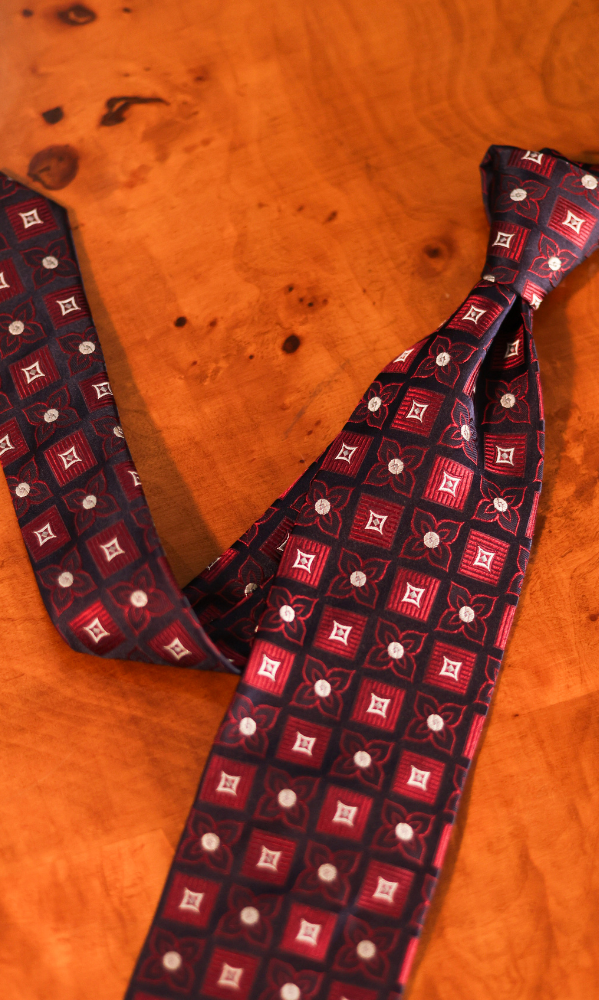 Corbata Azul navy con patrón de vitrales de flores en borgoña 100% Seda. Confeccionada en Italia.