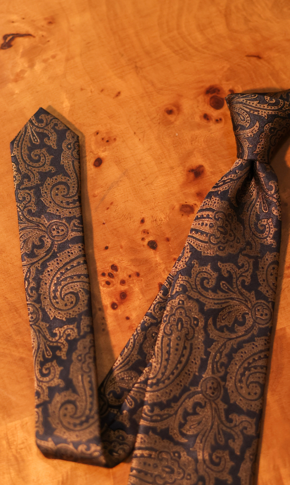 Corbata azul noche con paisley mostaza 100% Seda, confeccionada en Italia.