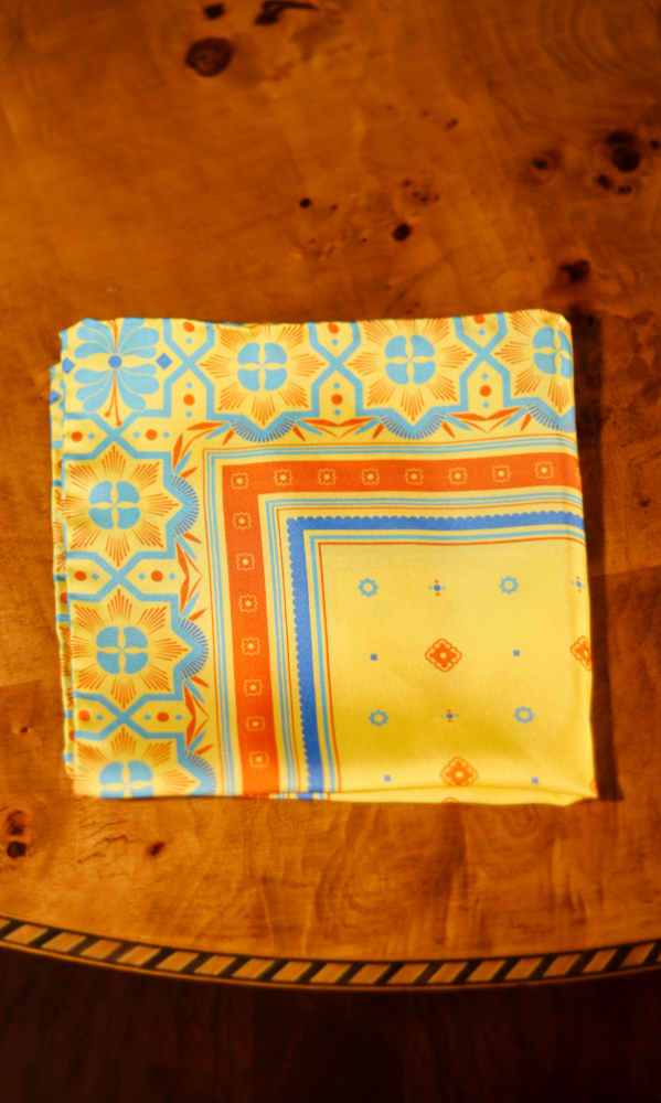 Pañuelo amarillo pastel con diseño trival anaranjado, azul y celeste