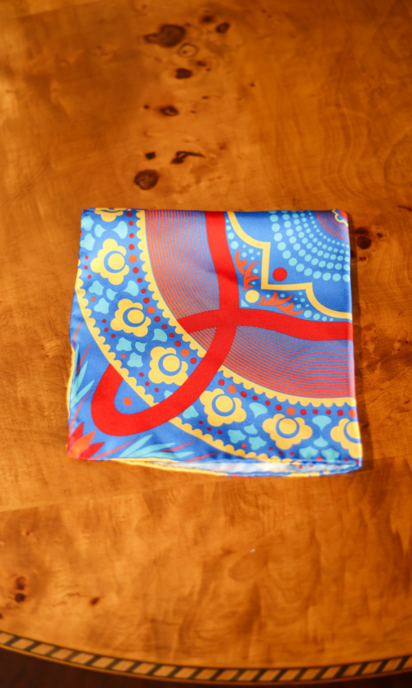 Pañuelo azul con mandala roja, anaranjado y amarillo